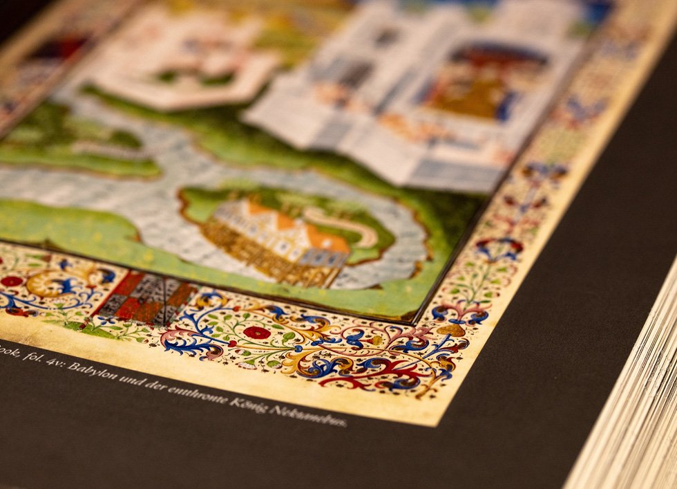 Über 350 zum Großteil mit Foliengold ausgestattete ganzseitige Bilder illustrieren den Text. Diese Miniaturseiten ermöglichen einen Einblick in acht Jahrhunderte europäische Kunstgeschichte: durch unverwechselbar reproduzierte Prachtseiten aus 154 verschiedenen Handschriften aus mehr als 40 Bibliotheken weltweit.