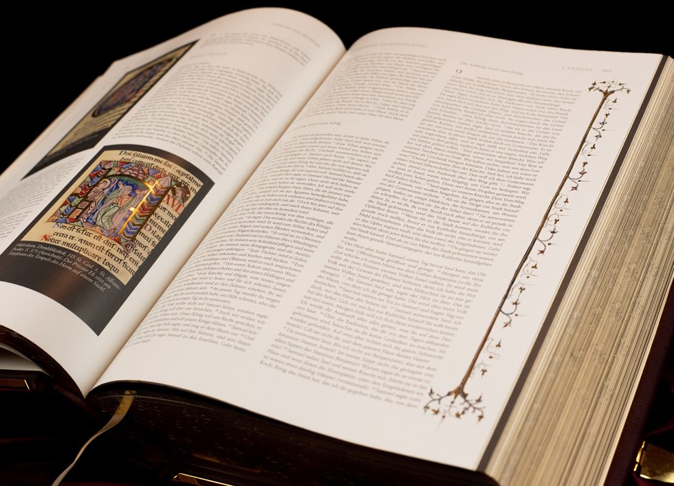 Sie enthält die vollständige Ausgabe der Bibel (Altes und Neues Testament) mit 1.024 Seiten im Format von 34 x 24 cm auf feinstem Volumenpapier in High-End-Faksimiledruck mit Druckgold, Foliengold und Patina.